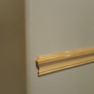 This is a photo of a chair rail that needed a coped stop on a wall that makes a 90° bull nose turn. Giving the allusion that the chair rail turns and goes into the wall.